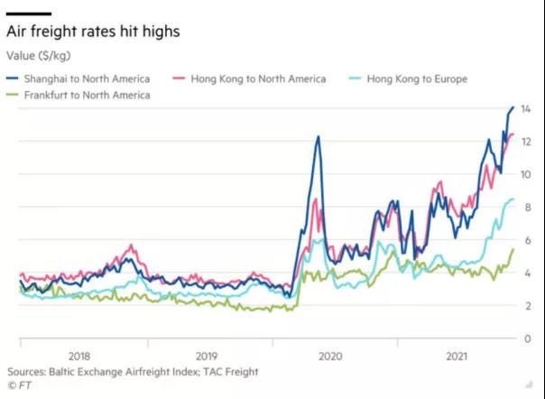 據(jù)英國《金融時報》(FT)報道,上周,從上海到北美的航線價格達到了每千克14美元(約89人民幣),遠高于8月底的每千克8美元(約合人民幣51元),更刷新了去年年初的每千克12美元(約合人民幣76元)的歷史記錄。